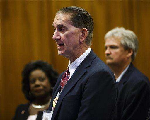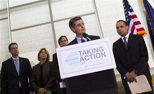 Dan Wyant, director of the Michigan Department of Environmental Quality, speaks as city and state officials announce a plan to deal with lead levels in Flint's drinking water during a news conference on Friday, Oct. 2, 2015, at Kettering University in Flint, Mich.The city is now telling residents to use only cold water for drinking, cooking and making baby formula, and recommending they use the certified filters. (Danny Miller/The Flint Journal-MLive.com via AP) LOCAL TELEVISION OUT; LOCAL INTERNET OUT; MANDATORY CREDIT The Associated Press