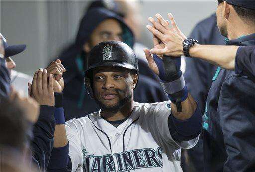 Seattle Mariners' Robinson Cano is congratulated after scoring a run on wild pitch by Houston Astros' Scott Kazmir during the second inning of a baseball game Wednesday, Sept. 30, 2015, in Seattle. (AP Photo/Stephen Brashear) The Associated Press