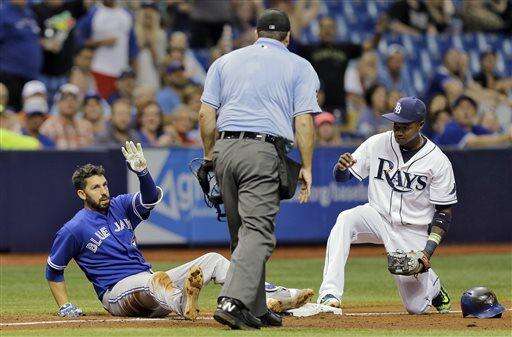 Toronto Blue Jays' Chris Colabello, left, looks for time out from home plate umpire Dan Bellino, center, after his triple hit the catwalk during the seventh inning of a baseball game Friday, Oct. 2, 2015, in St. Petersburg, Fla. Late with the tag is Tampa Bay Rays third baseman Tim Beckham. (AP Photo/Chris O'Meara) The Associated Press