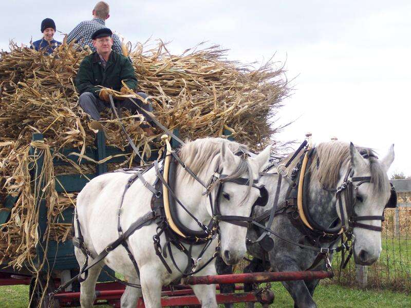 After a quick trip to "corn college," visitors can hit the fields and pick some of the corn that will feed the farm's cows and sheep in the winter. They can help "shuck" - peel the husks from the ears - and "shock" - bundle full stalks to dry - and store the harvest in the corn crib when the horse-drawn wagon in the field is full.