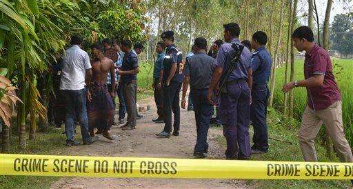 Bangladeshi security officers stand by the site where a Japanese Kunio Hoshi was killed at Mahiganj village in Rangpur district, 300 kilometers (185 miles) north of Dhaka, Bangladesh, Saturday, Oct. 3, 2015. Masked assailants riding a motorbike shot and killed the Japanese man in northern Bangladesh on Saturday, police said, the second foreigner in a week to be gunned down in the South Asian country. Hoshi had started a farm in Rangpur, about 300 kilometers (185 miles) north of Dhaka, to produce grass. (AP Photo/Ripon Islam) The Associated Press