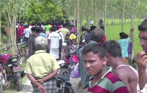 In this image made from video, bystanders watch as investigators work at the site where Japanese national Kunio Hoshi was shot and killed in Mahiganj village in Rangpur district, Bangladesh, Saturday, Oct. 3, 2015. Masked assailants riding a motorbike shot and killed a Japanese man in northern Bangladesh on Saturday, police said, the second foreigner in a week to be gunned down in the South Asian country. (APTN via AP) The Associated Press