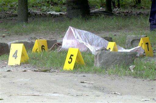 In this image made from video, evidence markers are used as investigators work at the site where Japanese national Kunio Hoshi was shot and killed in Mahiganj village in Rangpur district, Bangladesh, Saturday, Oct. 3, 2015. Masked assailants riding a motorbike shot and killed a Japanese man in northern Bangladesh on Saturday, police said, the second foreigner in a week to be gunned down in the South Asian country. (APTN via AP) The Associated Press