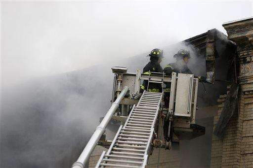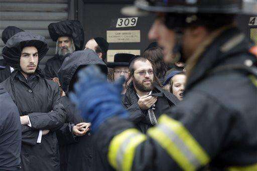 Onlookers watch as firefighters work at the at the scene of an explosion in the Brooklyn borough of New York, Saturday, Oct. 3, 2015. Firefighters in New York say one person is dead and three more have been injured in an apparent explosion and fire at a three-story building in the Borough Park neighborhood. (AP Photo/Mary Altaffer) The Associated Press