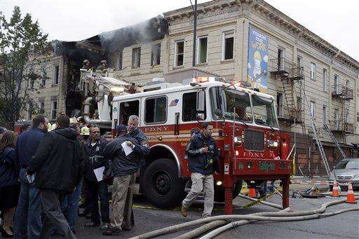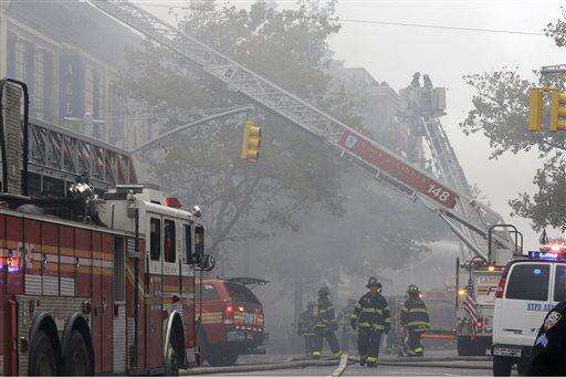Firefighters work at the at the scene of a fatal explosion in the Brooklyn borough of New York on Saturday, Oct. 3, 2015. Fire Commissioner Daniel Nigro says the explosion apparently happened after a stove was disconnected. (AP Photo/Mary Altaffer) The Associated Press