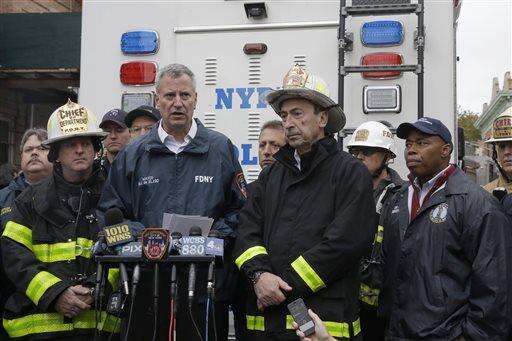 New York City Mayor Bill de Blasio, second from left, Fire Commissioner Daniel A. Nigro, second from right, and Brooklyn Borough President Eric Adams speak to reporters during a news conference near the scene of a fatal explosion in the Brooklyn borough of New York on Saturday, Oct. 3, 2015. Nigro says the explosion apparently happened after a stove was disconnected. (AP Photo/Mary Altaffer) The Associated Press