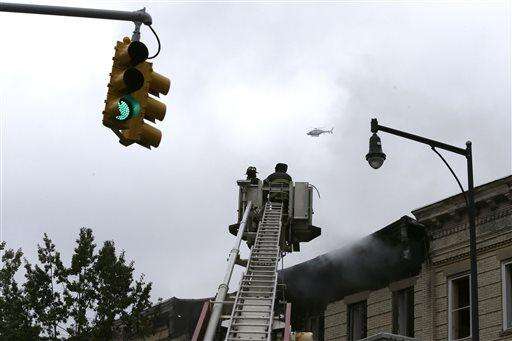 A helicopter flies past firefighters working at the scene of a fatal explosion in the Brooklyn borough of New York on Saturday, Oct. 3, 2015. Fire Commissioner Daniel Nigro says the explosion apparently happened after a stove was disconnected. (AP Photo/Mary Altaffer) The Associated Press