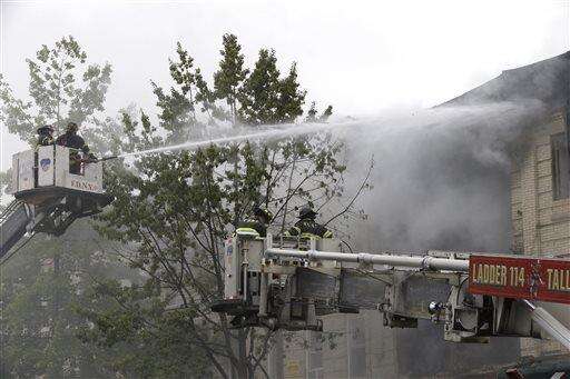 Firefighters work at the at the scene of an explosion at a three-story building in the Borough Park neighborhood in the Brooklyn borough of New York, Saturday, Oct. 3, 2015. Firefighters in New York say one person is dead and three more have been injured in an apparent explosion and fire. (AP Photo/Mary Altaffer) The Associated Press