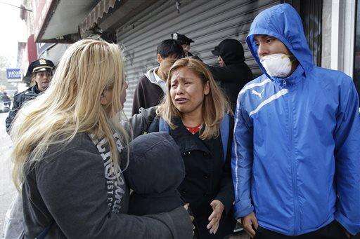 A woman, center, who says she lives near the scene of an explosion, is comforted by another woman, left, Saturday, Oct. 3, 2015, in the Brooklyn borough of New York. Firefighters in New York say one person is dead and three more have been injured in an apparent explosion and fire at a three-story building in the Borough Park neighborhood. (AP Photo/Mary Altaffer) The Associated Press