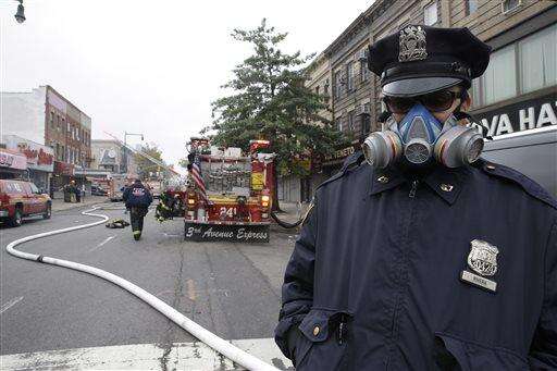 A police officer wears a mask while working near the scene of an explosion in the Brooklyn borough of New York, Saturday, Oct. 3, 2015. Firefighters in New York say one person is dead and three more have been injured in an apparent explosion and fire at a three-story building in the Borough Park neighborhood. (AP Photo/Mary Altaffer) The Associated Press