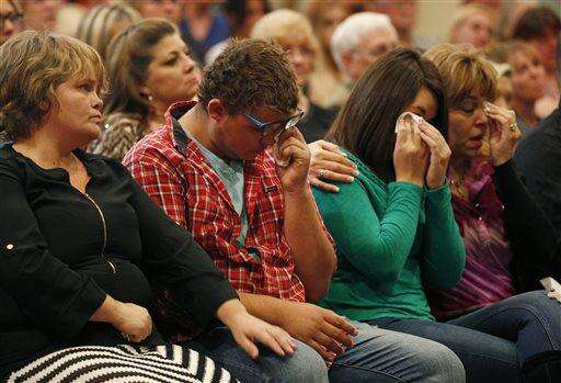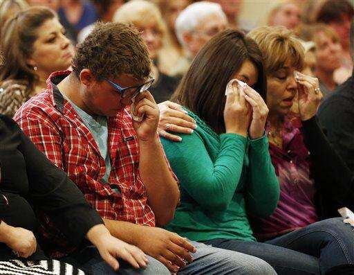 From left, Mathew Downing, Lacey Scroggins and Lisa Scroggins wipe their eyes during a church service at the New Beginnings Church of God, Sunday, Oct. 4, 2015, in Roseburg, Ore. Mathew Downing and Lacey Scroggins are survivors of the shooting at Umpqua Community College. (AP Photo/John Locher)
