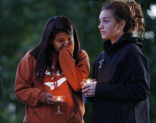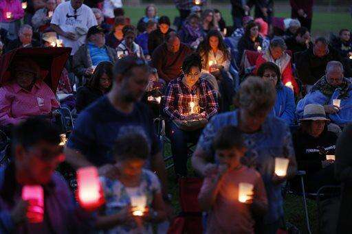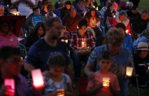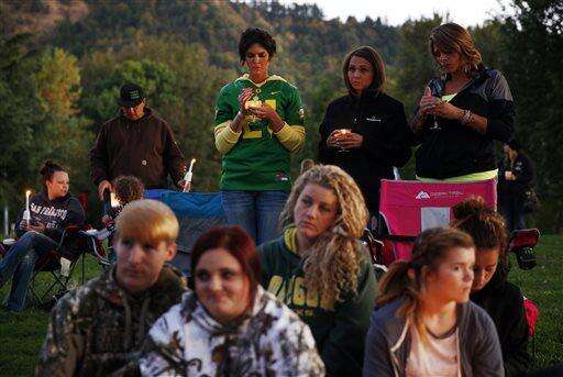 People hold candles during a prayer vigil Saturday, Oct. 3, 2015, in Winston, Ore. The vigil was held in honor of the victims of the fatal shooting at Umpqua Community College on Thursday. (AP Photo/John Locher)