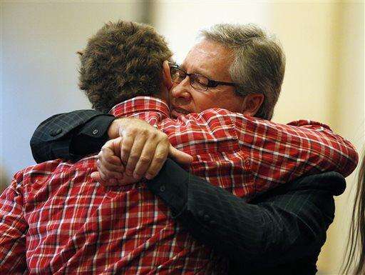 Randy Scroggins, pastor at New Beginnings Church of God, right, embraces Mathew Downing during a church service at the New Beginnings Church of God, Sunday, Oct. 4, 2015, in Roseburg, Ore. Scroggins said Downing was spared by a gunman during a deadly rampage on a college campus and received an envelope with a flash drive from the shooter. (AP Photo/John Locher)