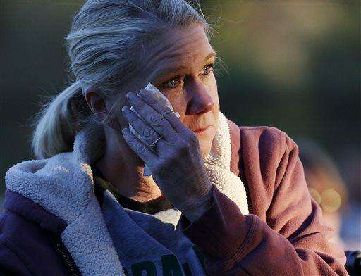 Tammy Hickok wipes her eyes during a prayer vigil Saturday, Oct. 3, 2015, in Winston, Ore. The vigil was held in honor of the victims of the fatal shooting at Umpqua Community College on Thursday. (AP Photo/John Locher)