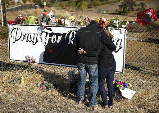 Charley Thompson, left, and his wife Rachel Thompson embrace as they place flowers at a makeshift memorial near the road leading to Umpqua Community College, Saturday, Oct. 3, 2015, in Roseburg, Ore. Armed with multiple guns, Chris Harper Mercer walked in a classroom at the community college, Thursday, and opened fire, killing several and wounding several others. (AP Photo/John Locher)