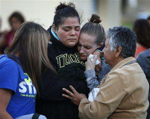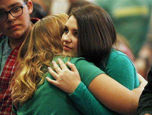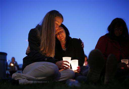 People embrace during a prayer vigil Saturday, Oct. 3, 2015, in Winston, Ore. The vigil was held in honor of the victims of the fatal shooting at Umpqua Community College on Thursday. (AP Photo/John Locher)