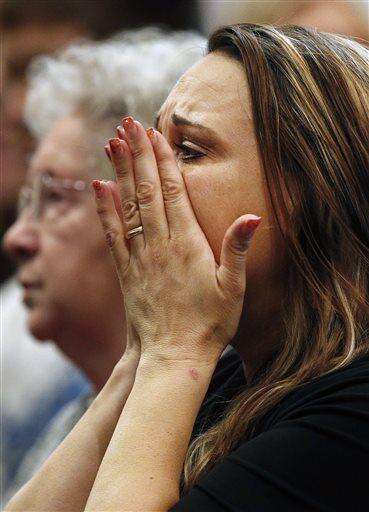 Sarah Mosley cries during a church service at the New Beginnings Church of God, Sunday, Oct. 4, 2015, in Roseburg, Ore. The service honored the victims of the fatal shooting at Umpqua Community College. (AP Photo/John Locher)