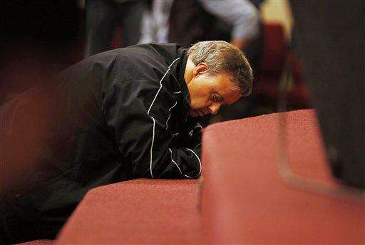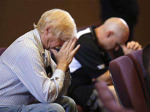 A man prays during a church service at the New Beginnings Church of God, Sunday, Oct. 4, 2015, in Roseburg, Ore. The service honored the victims of the fatal shooting at Umpqua Community College. (AP Photo/John Locher)