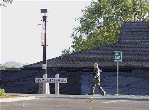 A Douglas County Sheriff's deputy walks past Snyder Hall at Umpqua Community College, Sunday, Oct. 4, 2015, in Roseburg, Ore. Armed with multiple guns, suspect Chris Harper-Mercer walked into a class at Snyder Hall on Thursday, killing nine and wounding several others before taking his own life. (AP Photo/Rich Pedroncelli)