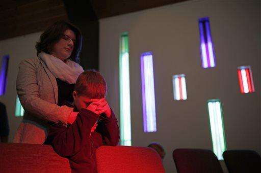Sunlight filtered through a red stained glass window illuminates seven-year-old Noah Cunnington as he prays with his mother, Ashley Cunnington, at the Hucrest Community Church of God Sunday, Oct. 4, 2015, in Roseburg, Ore. The church held a special service to address the shooting at Umpqua Community College. (AP Photo/John Locher)
