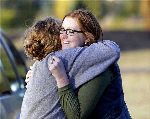 Lacey Scroggins, right, receives a hug during a church service at the New Beginnings Church of God Sunday, Oct. 4, 2015, in Roseburg, Ore. Scroggins is a survivor of the fatal shooting at Umpqua Community College. (AP Photo/John Locher)