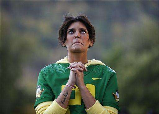 Brittany Gaddis prays during a prayer vigil Saturday, Oct. 3, 2015, in Winston, Ore. The vigil was held in honor of the victims of the fatal shooting at Umpqua Community College on Thursday. (AP Photo/John Locher)