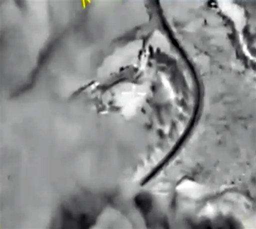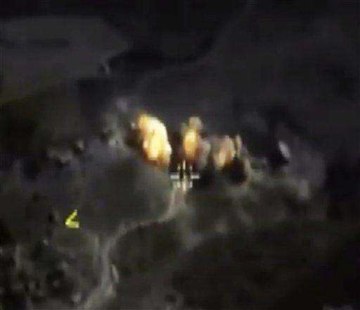In this photo made from the footage taken from Russian Defense Ministry official web site on Saturday, Oct. 3, 2015 a bomb explosion is seen in Syria. Pentagon officials urged the Russian military on Thursday to focus its airstrikes in Syria on Islamic State fighters rather than opponents of Syrian President Bashar Assad, U.S. administration officials said. (Russian Defense Ministry Press Service via AP) The Associated Press