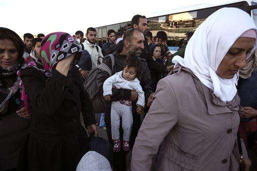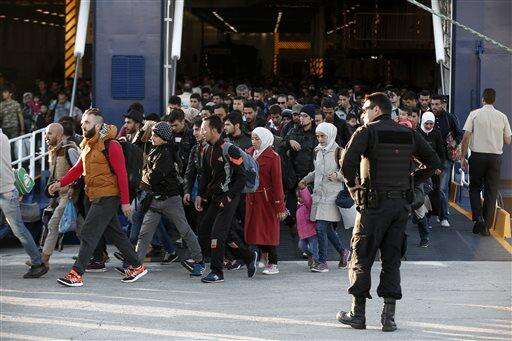 A policeman watches migrants and refugees disembarking from a ferry after their arrival from the Greek island of Lesbos at the Athens' port of Piraeus, Sunday, Oct. 4, 2015. The U.N. refugee agency is reporting a “noticeable drop” this week in arrivals of refugees by sea into Greece _ as the total figure for the year nears the 400,000 mark. Overall, the UNHCR estimates 396,500 people have entered Greece via the Mediterranean this year with seventy percent of them are from war-torn Syria. (AP Photo/Yorgos Karahalis) The Associated Press