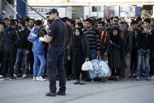 A policeman stands guard in front of a queue by migrants and refugees waiting to get on buses which will transfer them at a metro station after their arrival from the Greek island of Lesbos at the Athens' port of Piraeus, Sunday, Oct. 4, 2015. The U.N. refugee agency is reporting a “noticeable drop” this week in arrivals of refugees by sea into Greece _ as the total figure for the year nears the 400,000 mark. Overall, the UNHCR estimates 396,500 people have entered Greece via the Mediterranean this year with seventy percent of them are from war-torn Syria. (AP Photo/Yorgos Karahalis) The Associated Press