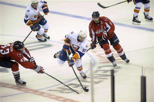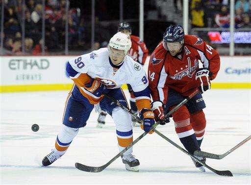 New York Islanders' Kirill Petrov (90) and Washington Capitals' Justin Williams (14) look to the puck during the first period of an NHL hockey game on Sunday, Oct. 4, 2015 in Washington. (AP Photo/Kevin Wolf)