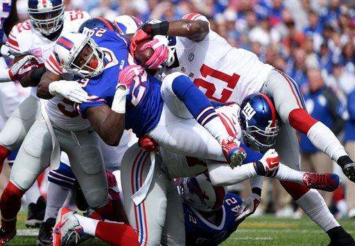Buffalo Bills running back Karlos Williams, center, is tackled by New York Giants players during the first half of an NFL football game, Sunday, Oct. 4, 2015, in Orchard Park, N.Y. (AP Photo/Gary Wiepert) The Associated Press