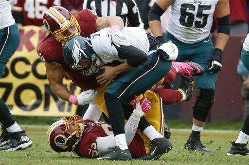 Notes: Bradford finished 15 for 28 for 270 yards. His three TD tosses equaled his season total through three games. ... Redskins K Dustin Hopkins went 3 for 3 on field-goal tries, making from 20, 33 and 38 yards.