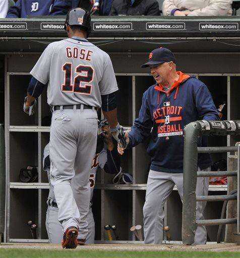Detroit Tigers' Anthony Gose (12), celebrates with hitting coach Wally Joyner right, in the dugout after scoring on a Nick Castellanos double during the first inning of a baseball game Sunday, Oct. 4, 2015 in Chicago. (AP Photo/Paul Beaty) The Associated Press