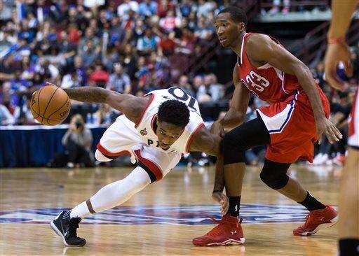 Toronto Raptors' DeMar DeRozan, left, regains his balance as he drives past Los Angeles Clippers' Wesley Johnson during the second half of an NBA preseason basketball game, Sunday, Oct. 4, 2015 in Vancouver, British Columbia. (Darryl Dyck/The Canadian Press via AP) MANDATORY CREDIT The Associated Press