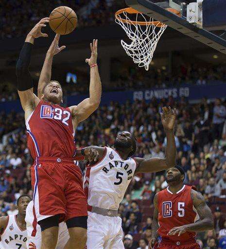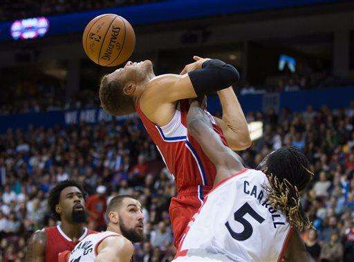 Los Angeles Clippers' Blake Griffin, center, is fouled by Toronto Raptors' DeMarre Carroll, right, during the first half of an NBA preseason basketball game, Sunday, Oct. 4, 2015 in Vancouver, British Columbia. (/The Canadian Press via AP) MANDATORY CREDIT The Associated Press