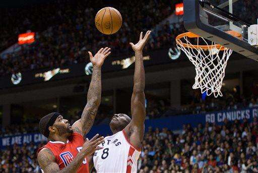 Los Angeles Clippers' Blake Griffin (32) goes up for the rebound against Toronto Raptors' DeMarre Carroll (5) during the first half of an NBA preseason basketball game, Sunday, Oct. 4, 2015 in Vancouver, British Columbia. (Darryl Dyck/The Canadian Press via AP) MANDATORY CREDIT The Associated Press