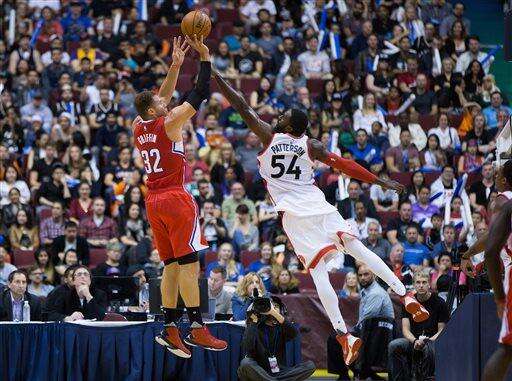 Los Angeles Clippers' Blake Griffin, left, shoots over Toronto Raptors' Patrick Patterson during the second half of an NBA preseason basketball game, Sunday, Oct. 4, 2015 in Vancouver, British Columbia. (Darryl Dyck/The Canadian Press via AP) MANDATORY CREDIT The Associated Press