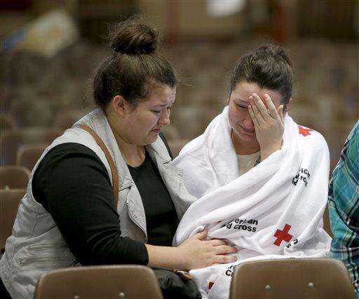 FILE - In this Thursday, Oct. 1, 2015 file photo, Hannah Miles, right, sits with her sister, Hailey, after a fatal shooting at Umpqua Community College in Roseburg, Ore. Harper-Mercer took multiple lives Thursday in chilling fashion before killing himself as officers closed in, placing the small town of Roseburg among settings that have become infamous for inexplicable violence. (Andy Nelson/The Register-Guard via AP, File) MANDATORY CREDIT The Associated Press