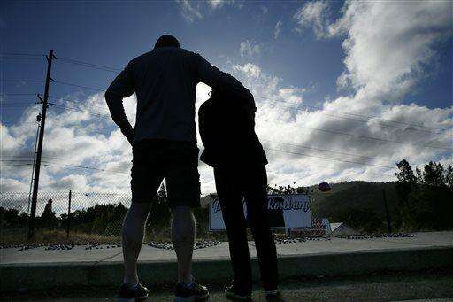 FILE - In this Saturday, Oct. 3, 2015 file photo, Dave Griffiths, left, puts his arm around his wife, Robin Griffiths, as they visit a memorial near the road leading to Umpqua Community College in Roseburg, Ore. Armed with multiple guns, Christopher Harper-Mercer, walked in a classroom at the community college Thursday and opened fire. (AP Photo/John Locher, File) The Associated Press