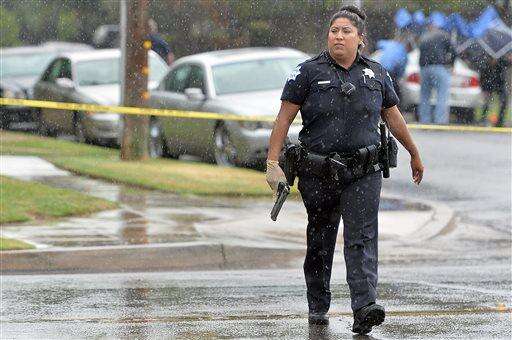 In this Thursday, Oct. 1, 2015 file photo, a Fresno Police Officer carries a weapon away from the scene where two people were fatally shot at North San Pablo Avenue and East Barstow Avenue in Fresno, Calif. Fresno police identified deceased as brothers as Willie Ford, 19, and Denzel Ford, 18. A third brother, 17-year-old Benzo Ford, died July 12 when a bullet fired from a nearby alley came through a window into a bedroom. Police say they believe he was targeted. (Silvia Flores/The Fresno Bee via AP) The Associated Press