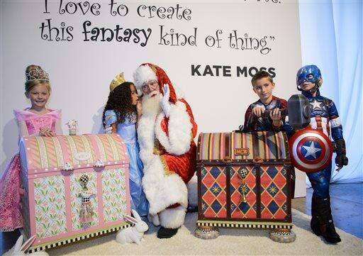In this photo provided by Neiman Marcus, Santa Claus, portrayed by Brady White, is surround by Mia Marrow, 5, from left, McKenzy Dodson, 6, Lawson LeBlanc, 7, and Knox Denton, 6, as the children show off their Chasing Fireflies Ultimate Collection costumes during the launch of the Neiman Marcus Christmas Book, Tuesday, Oct. 6, 2015 in Dallas. The costumes are included inside a personalized MacKenzie-Childs trunk, pink for girls and blue for boys, as part of the Ultimate Children’s Costumes package available for $5,000. (Tim Sharp/Neiman Marcus via AP) The Associated Press