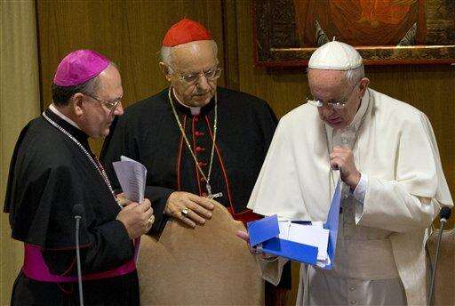 Pope Francis, right, checks a folder next to Bishop Fabio Fabene, left, and Cardinal Lorenzo Baldisseri as they arrive at a morning session of the two week-long Synod of bishops, at the Vatican, Tuesday, Oct. 6, 2015. (AP Photo/Alessandra Tarantino) The Associated Press