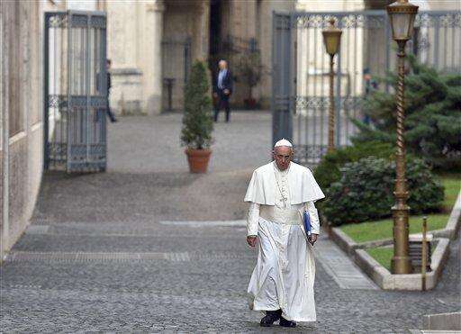 Pope Francis arrives for a morning session of the two-week bishops' Synod on family issues, at the Vatican, Tuesday, Oct. 6 2015. (Ettore Ferrari/ANSA via AP) The Associated Press