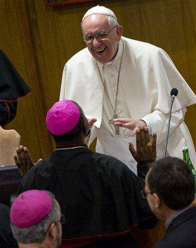 Pope Francis smiles as he talks with a bishop before the start of a morning session of the Synod of bishops, at the Vatican, Tuesday, Oct. 6, 2015. (AP Photo/Alessandra Tarantino) The Associated Press