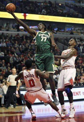 Milwaukee Bucks' Johnny O'Bryant, (77), shoots against Chicago Bulls' Aaron Brooks (0), and Bobby Portis (5), during the first half of an NBA preseason basketball game Tuesday, Oct. 6, 2015, in Chicago. (AP Photo/Paul Beaty) The Associated Press