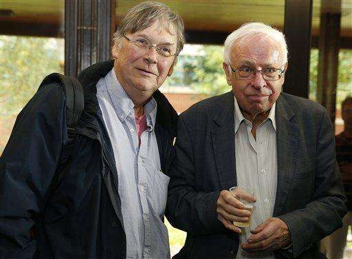 Sweden's Tomas Lindahl, right, one of the joint winners of the 2015 Nobel Prize for Chemistry, stands with the 2001 Nobel Prize in Physiology or Medicine, Tim Hunt, who congratulates him at the Francis Crick Institute in Potters Bar, north London, England, Wednesday, Oct. 7, 2015. Sweden's Tomas Lindahl, American Paul Modrich and U.S.-Turkish scientist Aziz Sancar won the Nobel Prize in chemistry on Wednesday for "mechanistic studies of DNA repair. (AP Photo/Alastair Grant)