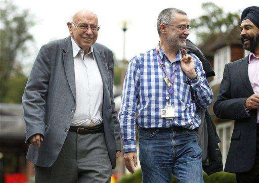 Sweden's Tomas Lindahl, left, one of the joint winners of the 2015 Nobel Prize for Chemistry, smiles smiles as he arrives for a press conference, at the Francis Crick Institute in Potters Bar, England, Wednesday, Oct. 7, 2015. Sweden's Tomas Lindahl, American Paul Modrich and U.S.-Turkish scientist Aziz Sancar won the Nobel Prize in chemistry on Wednesday for "mechanistic studies of DNA repair. (AP Photo/Alastair Grant)