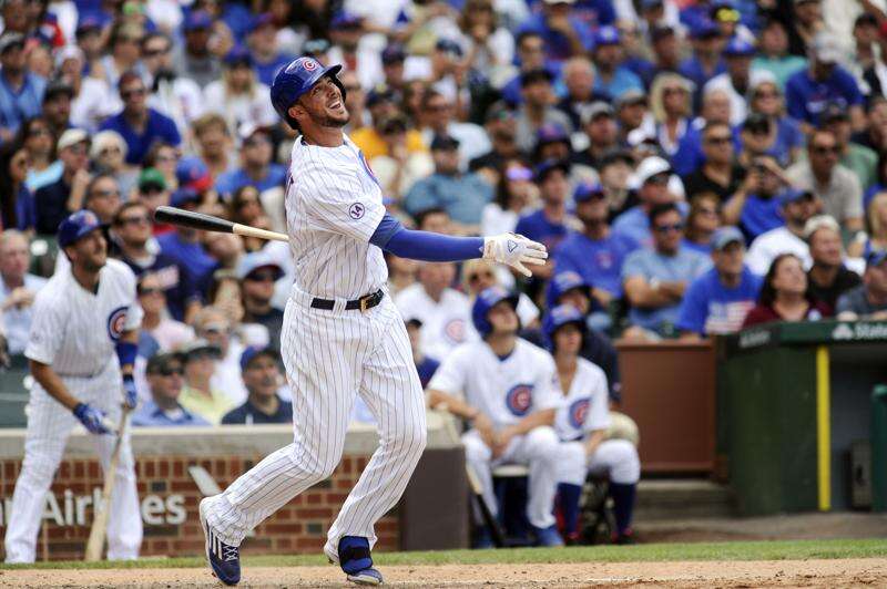 Chicago Cubs' Kris Bryant watches his walk off home run during the ninth inning against the Cleveland Indians on Monday, Aug. 24, 2015, in Chicago. The Cubs beat the Indians 2-1.