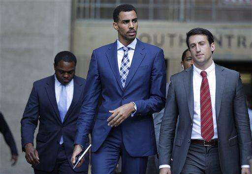 Thabo Sefolosha, center, leaves criminal court in New York, Wednesday, Oct. 7, 2015. The professional basketball player was about to give a handout to a man asking for money when police officers took him to the ground and arrested him, a former teammate testified Wednesday. (AP Photo/Seth Wenig) The Associated Press