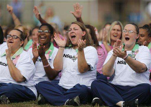 Melissa Etheridge performs for inmates, including, from left, Yvonnda Padgett, Georgia Peterman and Jessica Brown, at the Ohio Reformatory for Women in Marysville, Ohio, on Wednesday, Oct. 7, 2015. Etheridge says a video of female inmates singing one of her songs led to her performing with them. (Jonathan Quilter/Columbus Dispatch via AP)